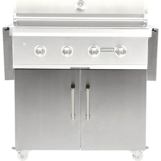 House your 36-inch gas grill in this stainless steel Coyote grill cart. Its fold-down shelving adds flat work space to your cooking area, and the integrated storage space behind the double self-closing doors holds grilling accessories and utensils. This Coyote grill cart has locking casters for portability, so you can roll it across the yard.