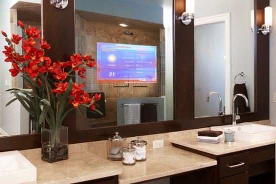 The Séura Vanity TV Mirror combines a high quailty LCD TV with a beautiful vanity mirror. Séura's propietary vanishing glass allows for a clear, bright TV picture when the television is turned on, and no trace of the TV when turned off. Seamlessly incorporate video into bathrooms, dressing rooms and spas.